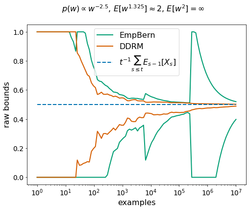 can go off the rails. So people have all sorts of hacks to keep estimators stable, such as clipping or self-normalization. Fortunately robust confidence sequences can consume unbounded importance weights with unbounded variance and adapt to an unknown finite moment greater than 1. Here’s an example from the DDRM paper with Pareto distributed importance weights.